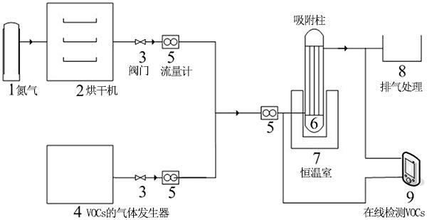 在吸附柱中研究了活性炭吸附甲苯的能力;钚蕴康挠昧繛10g,吸附質(zhì)甲苯氣體由氣體發(fā)生器產(chǎn)生。通過測定吸附前后甲苯的濃度,得到了不同條件下活性炭吸附性能的數(shù)據(jù)。實(shí)驗(yàn)吸附裝置的流程圖如圖2所示。將來自氣體發(fā)生器的甲苯氣體與氮?dú)饣旌希缓髮⑵湮皆诤銣匚剿。通過在線FID檢測器測量吸附前后的甲苯含量,并通過流量計控制甲苯流量。當(dāng)脫氣和入口濃度在30分鐘內(nèi)保持一致時,認(rèn)為已達(dá)到吸附平衡。吸附氣體通過廢氣出口排空。