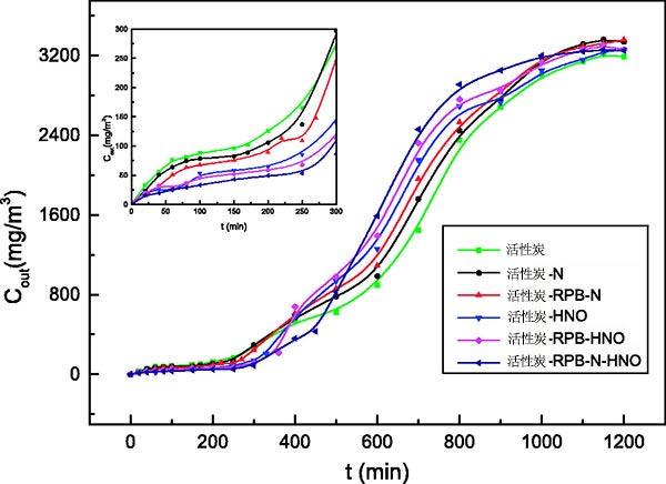 甲苯在不同活性炭上的穿透曲線和吸附等溫曲線如圖3所示和4。不同活性炭上的吸附速率從高到低依次為:活性炭-RPB-N-HNO>活性炭-RPB-HNO>活性炭-HNO>活性炭-RPB-N>活性炭-N>原始活性炭。吸附速率越大,滲透時間越長,這又與活性炭的復(fù)雜孔徑分布和表面官能團(tuán)的量有關(guān)。活性炭的微孔體積在高溫氮?dú)庵性龃,這增加了活性炭通道的內(nèi)部孔隙體積。在高重力氮?dú)猸h(huán)境中,不利于甲苯吸收的原始活性炭的內(nèi)部結(jié)構(gòu)被重新分配并分裂成新的空間構(gòu)型,這進(jìn)一步增加了突破時間。HNO 3處理的活性炭的突破時間在高重力環(huán)境中的改性大于具有HNO 3浸泡的改性活性炭。這是因?yàn)镠NO 3分散的細(xì)小液滴中,這增加了其與活性炭的表面和內(nèi)部的接觸概率,這反過來增強(qiáng)了活性炭上含氧官能團(tuán)的負(fù)載并增加了它們的吸附效率。在重力作用下,復(fù)合改性處理的活性炭具有較長的穿透時間和較大的吸附速率,因?yàn)槲锢砀男栽黾恿吮缺砻娣e,增大了孔體積分布,而化學(xué)改性增加了表面氧基團(tuán)數(shù)。反過來,這些特性增強(qiáng)了吸附性能。