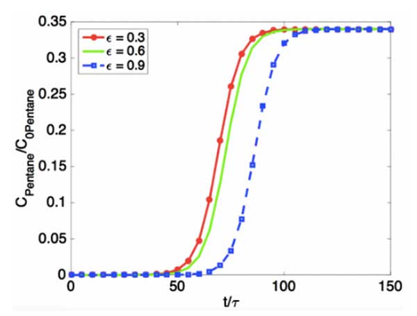 模擬三種不同孔隙率的活性炭的吸附動(dòng)力學(xué)(圖2)。通過多組分加權(quán)平均計(jì)算C/C0(我們模擬每種組分的吸附動(dòng)力學(xué),計(jì)算它們相應(yīng)的穿透曲線,并根據(jù)它們?cè)谠加驼魵庵械捏w積分?jǐn)?shù)得出加權(quán)平均值)。從圖3中可以看出,較高的孔隙率可以在較長(zhǎng)的穿透時(shí)間內(nèi)重新產(chǎn)生,這與較高的孔隙率將導(dǎo)致較高的表面積并且將使反應(yīng)器中的吸附物的停留時(shí)間更長(zhǎng)的事實(shí)一致。