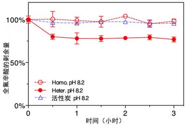 在存在和不存在活性炭的情況下,在密封的40mL燒瓶中在酸性,中性和堿性pH條件下進行全氟辛酸與S 2 O 8的反應,反應溫度為80℃,用恒溫水浴保持。對于大多數實驗,初始全氟辛酸濃度為0.5μM,活性炭濃度為200 mg/L,500 mg/L或1000 mg/L。對于酸性和堿性條件實驗,使用濃硫酸或150mM氫氧化鈉溶液將pH值調節(jié)至1.0或13.0。對于在pH 8.2下進行的實驗,使用100mM硼酸鹽作為緩沖液(NaB(OH)4/H 3 BO 4)。在所有實驗中包括五個重復。