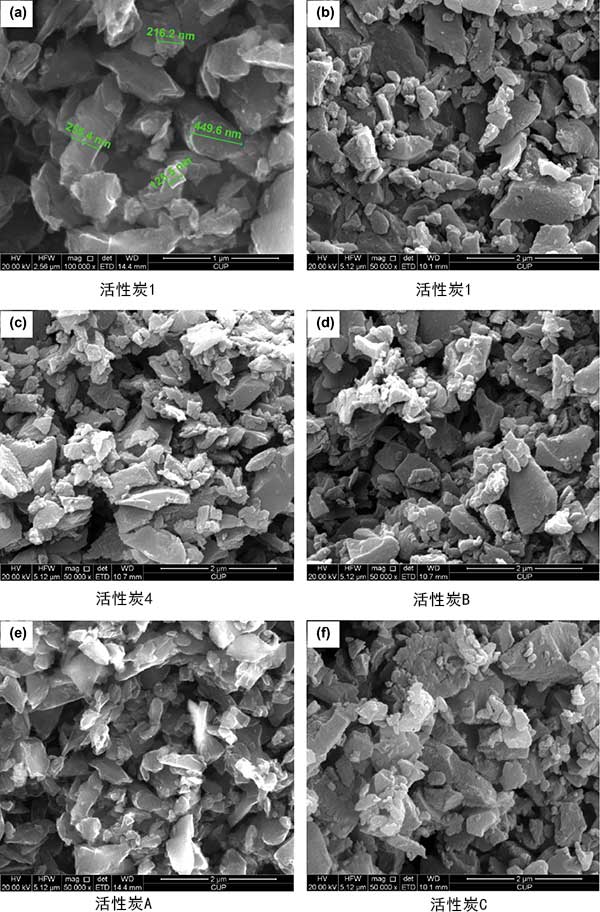 為了研究活性炭結(jié)構(gòu)對(duì)氣體混合物的分離性能的影響,七種活性炭,即活性炭1、2、3、4和活性炭A、B、C。評(píng)估了SEM圖像及其顆粒分布示于圖2和3中。對(duì)比了活性炭的比表面積,微孔體積,孔徑,中值粒徑和骨架密度等。在這些活性炭中,1234衍生自相同類(lèi)型的活性炭,并具有相同的比表面積,微孔體積,孔徑和骨架密度,但具有不同的粒徑。這類(lèi)活性炭的中值粒徑分別為1.14、1.41、2.07和6.18μm。在活性炭中,粒徑?jīng)Q定了微孔的利用率,孔徑控制了氣體分子進(jìn)入活性炭孔隙的可能性,比表面積和孔隙體積決定了存儲(chǔ)容量。這種孔徑和粒徑比較適合分離氣體混合物,但是,對(duì)于孔體積或比表面積,CO 2吸收越大越好。下面我們選擇兩種氣體混合物來(lái)評(píng)估活性炭結(jié)構(gòu)對(duì)分離性能的影響,即兩種碳?xì)浔壤煌幕旌蠚怏w。將這兩種進(jìn)料氣體混合物與七種活性炭進(jìn)行分離實(shí)驗(yàn)。實(shí)驗(yàn)條件溫度和初始?jí)毫Ψ謩e為10℃和約2.0MPa。