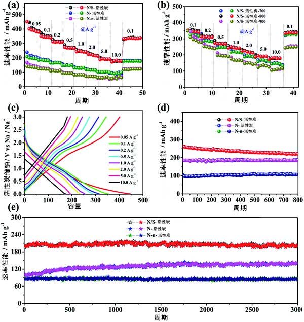 為了進一步描述制成活性炭的電化學行為,進行循環(huán)伏安法和恒電流充電放電測試。為了證明活性炭的優(yōu)點,還在相同的質(zhì)量負載下測試了幾種活性炭的Na儲存性能,圖2a顯示了在0.05至10Ag-1的不同電流密度下測試5個循環(huán)。與其他兩個樣品相比,氮硫共摻雜活性炭顯示出優(yōu)異的速率性能,在高速測量之后仍然可以恢復高比容量。對于沒有S摻雜的活性炭,當電流密度增加時,電極提供的容量降低。相比之下,不同電流密度下的恒電流充電放電曲線進一步證實了這些速率的結(jié)果。因此,氮硫共摻雜活性炭電極表現(xiàn)出比其他對照樣品好得多的速率性能和優(yōu)異的鈉儲存性能。