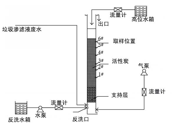活性炭反應(yīng)器工藝流程圖如圖1所示;钚蕴砍赜捎袡C玻璃制成,有機玻璃是柱式反應(yīng)器。活性炭池高度為2米。內(nèi)徑為63毫米。填充高度為1800毫米。碳層高度為1500毫米。砂濾器高度為300毫米。反應(yīng)體積為4.7 L.有5個水取樣口和碳池。底部有曝氣器,碳池頂部有溢流堰。水質(zhì)分析指標為紫外分光光度法和紫外分光光度計。