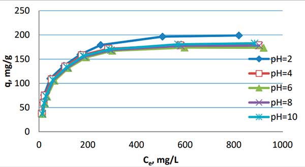 3.還發(fā)現(xiàn)了pH對活性炭的吸附效率的不顯著影響。觀察到與接近中性的溶液相比,酸性和堿性溶液的吸附更好。大量吸附是從pH=2的溶液中獲得的,但與pH=6的溶液的吸附相比,所獲得的吸附容量僅高9%。