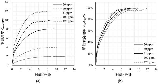 圖3:活性炭介質(zhì)的下游濃度(a)和及時突破百分比(b)。