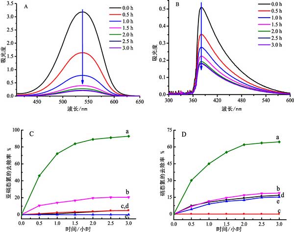 亞硝酸鹽和氨的記錄的紫外可見吸收光譜分別在圖3中。圖3AB明確顯示當活性炭用作光催化劑時,在厭氧條件下,亞硝酸鹽和氨的濃度與輻照時間同時下降。對照試驗也在活性炭催化劑存在或不存在下進行,照射或在黑暗中或不存在一種組分時進,亞硝酸鹽和氨的去除率如圖3CD所示。在活性炭鋅鐵氧體照射下,氨降解的平均去除率達到64.3%,而在沒有活性炭的情況下去除率僅為18.8%。結(jié)果明顯的是的活性炭鋅鐵氧體具有同時去除亞硝酸鹽和氨的光催化功能。