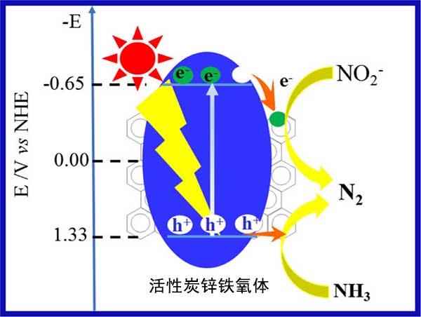 在紫外可見光照射下,基于活性炭鋅鐵氧體催化劑通過兩個步驟成功地同時去除亞硝酸鹽和氨。通過氣相色譜檢測產(chǎn)物表明在光催化過程中氮氣被釋放出來。XPS測量和鋅鐵氧體能帶結(jié)構(gòu)分析表明,鋅鐵氧體的還原電位低于亞硝酸鹽的還原電位,因此光生電子可以在照射下將亞硝酸鹽還原為氮氣。對比下高于氨的電位,因此光生空穴可以將氨氧化成氮氣;钚蕴恳饚兜募t移,光生電子空穴對的分離,亞硝酸鹽和氨的吸附,促進光催化活性。