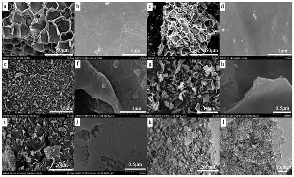 通過SEM和TEM研究了空氣氧化前后活性炭的微觀結(jié)構(gòu)(圖2)。在(圖2a,b)中,軟木材料呈蜂窩狀結(jié)構(gòu)并具有明顯的褶皺。在800℃碳化后,保留結(jié)構(gòu)并且包含該結(jié)構(gòu)的部分彼此緊密結(jié)合,看起來光滑(圖2c,d)。在350℃-450℃下空氣活化后,結(jié)構(gòu)單元被分離形成薄片(圖2e),這可歸因于細胞之間木質(zhì)素的降解;钚蕴砍尸F(xiàn)出層狀空氣氧化后的結(jié)構(gòu)(圖2的e-j)的。350℃和400℃活化的活性炭樣品表面相對光滑,在0.5-1μm的分辨率下未觀察到明顯的孔結(jié)構(gòu)(圖2f,h)。當氧化溫度升至450℃時,活性炭的表面顯著變化并觀察到大量的孔。圖2j顯示450℃活化樣品顯示出具有裂縫和空隙的粗糙表面。TEM結(jié)果(圖2k,i)顯示450℃活化的活性炭具有三維(3D)互連框架的分級微/中孔結(jié)構(gòu)。這些孔可以有助于廢水中染料的吸附。