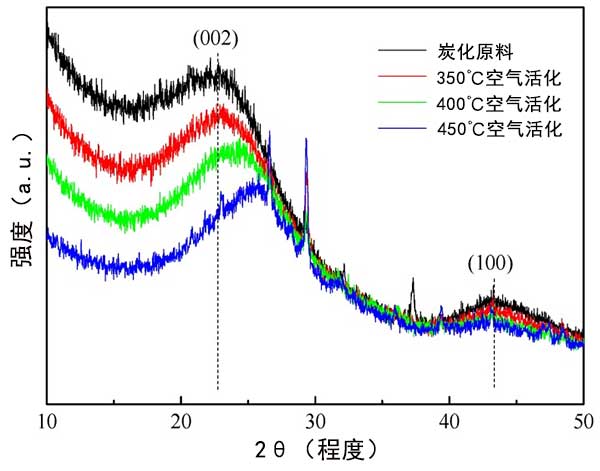圖3顯示了空氣氧化之前和之后活性炭的XRD圖譜。所有樣品在~24°處顯示典型的寬峰,在~43°處顯示弱峰,分別對應(yīng)于石墨碳的(002)和(100)平面。所有樣品的寬峰和弱峰反映了活性炭的低度石墨化。與炭化原材料相比,隨著氧化溫度的升高,(002)峰逐漸向較高角度移動。該運動表明空氣氧化后石墨結(jié)構(gòu)中(002)晶面的d-空間減小。結(jié)果表明,活性炭的空氣活化導(dǎo)致石墨結(jié)構(gòu)具有改善的致密性。