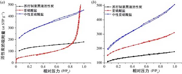 圖1顯示了活性炭在-196℃的氮?dú)馕降葴鼐和孔徑分布及其紋理特征。從看到的圖1中,活性炭的吸附等溫線在很大程度上受到制漿工藝的類型的影響。但是使用蘇打制漿黑液作為前體從活性炭獲得的等溫線遵循I型吸附等溫線;钚蕴康牡赵诜浅5偷南鄬(duì)壓力下略微增加,隨后在平臺(tái)形式中略微吸附增加,相對(duì)壓力增加至1,表明存在微孔性。但是,來自亞硫酸鹽的中性亞硫酸鹽制漿的活性炭的等溫線提供了I型和II型的吸附等溫線,這反映在碳結(jié)構(gòu)中存在一些中孔。
