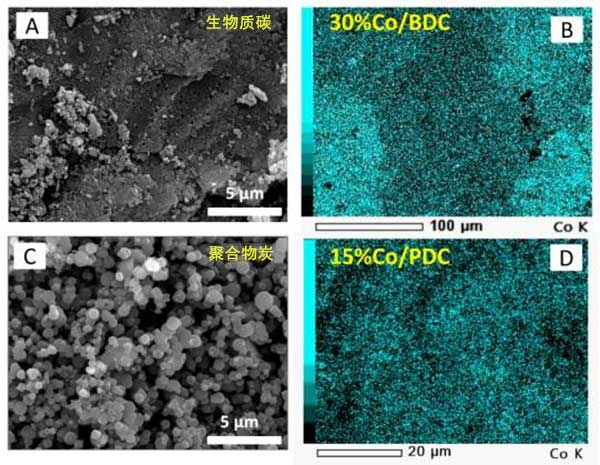 使用掃描電子顯微鏡(SEM)觀察由植物殼和酚醛樹脂的熱解獲得的活性炭的表面形態(tài),并分別在圖1A,C中示出?梢钥闯觯煌奶记绑w產(chǎn)生不同的表面形態(tài)。生物質衍生的碳顯示出剛性和致密的結構,這是典型的木炭特征。而聚合物衍生的碳呈現(xiàn)具有粒子網(wǎng)絡的碳球,在球體之間產(chǎn)生大的空隙。然后將兩種活性炭用作氧化鈷的載體。為了觀察金屬氧化物在活性炭上的分散,進行了SEM與能量色散X射線(EDX)的元素映射。圖1B,D表示裝載在兩種材料中的氧化鈷的代表。所有都顯示鈷材料(在青色中顯示)在活性炭中的均勻分散。這表明通過浸漬方法中描述的簡單化學計量計算很好地實現(xiàn)了元素鈷的目標負載。換句話說,上述結果清楚地顯示了制備氧化鈷活性炭的成功制備步驟。