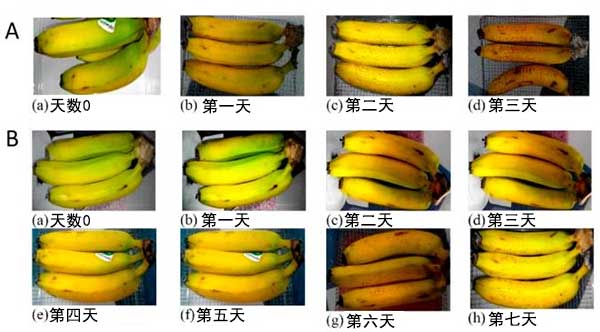 圖3A,B分別顯示了在沒有和使用氧化鈷浸漬的活性炭在封閉存儲期間的水果條件的日常記錄。使用活性炭15%氧化鈷材料,進行半定量檢查(即顏色和棕色區(qū)域)。當棕色主要出現(xiàn)時,長期保存時間被定義,并且香蕉從束中掉出來。當將香蕉存放在沒有活性炭吸附劑的封閉盒子中時,水果很快變得腐爛。僅在第三天,一束香蕉已經(jīng)從束中掉出來并出現(xiàn)棕色斑點。使用活性炭吸附劑情況下,可以清楚地看到水果保存時間的延長。相對于沒有活性炭,顏色的變化被延遲(圖3B)。結果表明氧化鈷浸漬的活性炭作為乙烯清除劑在儲存系統(tǒng)中的效果,因此延長了水果的儲存壽命。