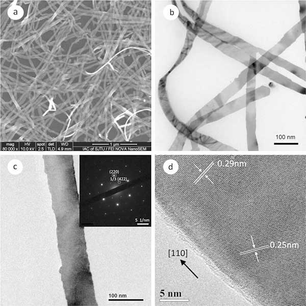圖1顯示了在活性炭上生長的銀納米帶的典型電子顯微鏡(EM)圖像。SEM圖像(圖1a)顯示獲得了豐富的線狀產(chǎn)物,具有非常少的準球形顆粒雜質(zhì)。圖1b是銀納米帶的典型TEM圖像。該圖中所示的納米帶的平均寬度為約45納米。從左側附近的扭曲納米帶測量的厚度為約9納米。位于TEM網(wǎng)格上的這種平坦且光滑的納米結構也通過右側的莫爾圖案來證實,其源自具有不同晶體取向的兩個或三個納米帶的堆疊。圖1c呈現(xiàn)單個納米帶的TEM圖像。其選擇區(qū)域電子衍射(SAED)圖案插入右上角,具有六重對稱性。
