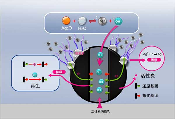 圖3:通過將載金屬活性炭浸入微溶的氧化銀上清液中來生長銀納米帶的原電池機制的示意圖。