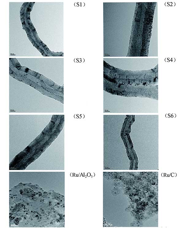 所有載釕活性炭上的釕負(fù)載量理論上為5%。通常,將活性炭加入120mL乙二醇中。并將混合物在超聲處理30分鐘以確保活性炭均勻分散。超聲處理后,在連續(xù)攪拌下滴加3.0mL RuCl 3水溶液30分鐘。然后是使用NaOH乙二醇溶液將混合物的pH調(diào)節(jié)至4.0。然后,在連續(xù)攪拌24小時(shí)后,將溶液放入微波合成反應(yīng)器中加熱100秒。過濾混合物溶液,用去離子水洗滌直至濾液的pH達(dá)到7.0,并在80℃下真空干燥。將樣品研磨成粉末使用。由于活性炭的表面是疏水的,它們傾向于在極性溶劑中聚集。并且由官能團(tuán)改性的活性炭可以提供足夠的孔隙以使釕納米顆粒均勻地分布在活性炭的表面上。在通過微波加熱的多元醇方法制備活性炭負(fù)載的釕納米顆粒。合成過程如圖1所示。