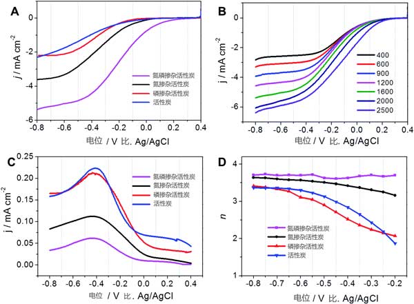 活性炭樣品通過(guò)兩步法制備,包括原位氧化聚合和高溫?zé)峤。這里,苯胺和植酸分別用作氮源和磷源。為了研究氮磷碳比對(duì)活性炭的氧化還原電催化活性的影響,在中性介質(zhì)中進(jìn)行循環(huán)伏安圖。旋轉(zhuǎn)圓盤(pán)電極伏安圖在氧飽和的50mM磷酸鹽緩沖溶液中進(jìn)行,結(jié)果顯示在圖2A中。在摻雜碳改性后,活性炭基催化劑的起始電位顯示出從0V到+0.22V的大的正向偏移,氧化還原電流密度也大大增加。此外,由共摻雜碳改性的活性炭電催化活性優(yōu)于由單摻雜碳改性的活性炭電催化活性。在進(jìn)行旋轉(zhuǎn)環(huán)盤(pán)電極測(cè)量以研究不同催化劑的過(guò)氧化氫的產(chǎn)生(圖2C)。正如預(yù)期的那樣,氮磷摻雜活性炭顯示出比其他催化劑更低的過(guò)氧化氫產(chǎn)生?梢钥闯,氮磷摻雜活性炭在氧化還原起始電位和高電流電流方面對(duì)氧化還原具有優(yōu)異的電催化活性,突出了N,P共摻雜和中孔結(jié)構(gòu)對(duì)氧化還原的重要性。