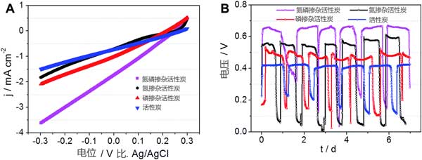 不同摻雜比的活性炭催化劑在微生物燃料電池中的實(shí)際性能,各種氧化還原催化劑的空氣陰極。線性掃描伏安法曲線由圖3A表明,所有的空氣陰極具有摻雜碳改性的活性炭催化劑表現(xiàn)出比原始活性炭催化劑的更高電流響應(yīng)。與氮摻雜和磷摻雜相比,氮磷共同摻雜的活性炭顯示高電流密度。如圖3B所示,使用雙摻雜的活性炭催化劑的空氣陰極燃料電池能夠在1000Ω的外部電阻上產(chǎn)生0.668V的穩(wěn)定電壓,這遠(yuǎn)高于本期制造的其它催化劑。這些結(jié)果意味著摻雜碳的改性是增強(qiáng)活性炭的氧化還原活性的可靠方法。此外,當(dāng)在微生物燃料電池的空氣陰極中用作氧化還原時(shí),由氮和磷共摻雜碳改性制備的活性炭?jī)?yōu)于氮磷單獨(dú)摻雜改性的活性炭。