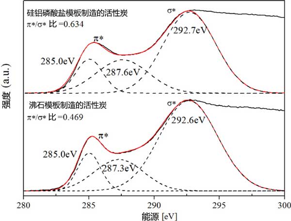 兩種模板化制造活性炭的EELS光譜在圖3顯示。這兩條曲線的sp 2/sp 3碳的分?jǐn)?shù)已經(jīng)顯示出與碳原子的雜化有關(guān),并且一系列高斯峰被擬合到下的去卷積。定量計(jì)算表明,硅鋁磷酸鹽模板化活性炭的光譜在兩個(gè)峰之間具有統(tǒng)計(jì)學(xué)上更高的比率,與無(wú)定形碳相比,這兩種活性炭的sp 2/sp 3碳具有更高比例。