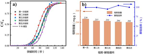 圖5:(a)循環(huán)實(shí)驗(yàn)期間的突破曲線。(b)吸附容量和解吸效率。