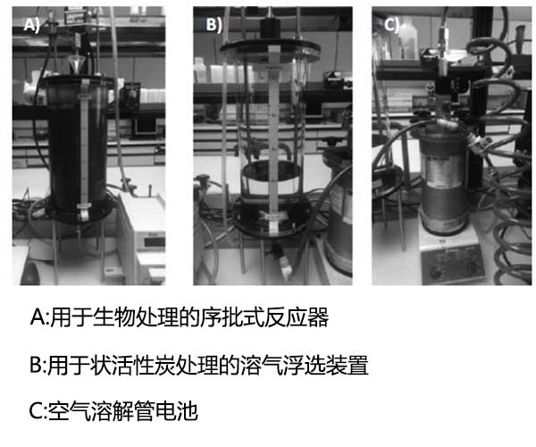 污水處理廠的活性污泥用于承載微生物,收集活性污泥并對(duì)其主要參數(shù)進(jìn)行表征銨,硝酸鹽,亞硝酸鹽,磷酸鹽,化學(xué)需氧量,生物需氧量,總懸浮固體和pH每周一次,并儲(chǔ)存在4°C直至使用。將5L活性污泥泵入生物處理的序批式反應(yīng)器,混合并充氣2小時(shí),然后使污泥靜置30分鐘。將1.7L上清液轉(zhuǎn)移至活性炭處理的溶氣浮選裝置單元,其中加入粉末狀活性炭并混合(30分鐘)。下一步包括加入凝結(jié)劑聚氯化鋁,12分鐘后加入絮凝劑。最后,將飽和水注入活性炭處理的溶氣浮選裝置裝置,開(kāi)始分離步驟(12分鐘)。整個(gè)過(guò)程持續(xù)了大約四個(gè)小時(shí)。