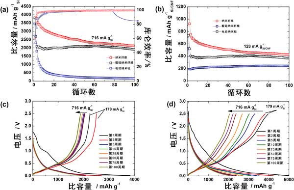 如圖4所示,從第一個(gè)循環(huán)的電壓分布中看出,兩個(gè)陽(yáng)極的第一個(gè)循環(huán)的額外貢獻(xiàn)來(lái)自不可逆的固體電解質(zhì)界面層形成和電解質(zhì)分解。對(duì)于電化學(xué)表征,在紐扣電池配置中使用鋰金屬作為對(duì)電極對(duì)所有硅陽(yáng)極進(jìn)行恒電流充電和放電。裸露的十億分之一硅陽(yáng)極在第一個(gè)循環(huán)中提供3445mAhg的放電容量,庫(kù)侖效率約為65%。從第二個(gè)循環(huán)開始,二氧化硅的硅載納米纖維陰極的比容量值急劇下降至2600mAhg,而納米纖維的靜電紡絲陽(yáng)極顯示出邊際下降,比容量為4000mAhg-1,庫(kù)侖效率均為約91%。比容量的急劇下降可歸因于二氧化硅的硅載納米纖維中的二氧化硅殼在第一次循環(huán)中不可逆鋰化。