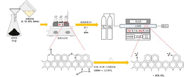圖1:通過硝酸處理和活化活性炭的程序和目的。
