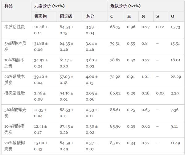 圖2:關(guān)于硝酸處理的活性炭的近似和元素分析的結(jié)果。