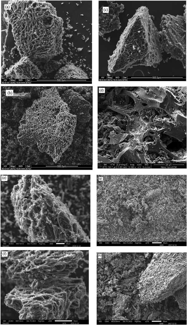 圖1:不同濃度的三種無機酸改性后活性炭的掃描電子顯微鏡圖像。