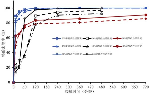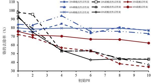 對鉻實現(xiàn)有效吸附所需的較高劑量可能意味著用硝酸,硫酸對活性炭進行化學(xué)氧化和磷酸除去吸附位點。具體地,當(dāng)考慮所用的劑量和初始濃度時,硫酸和磷酸改性產(chǎn)生的活性炭與沒改性的相比具有較差的性能。因此,基于使用不同前體的研究,不能推廣酸改性對活性炭性能的影響。對于不同濃度硫酸磷酸改性和20%硝酸改性活性炭,在pH 1下各種吸附劑的處理能力都超過75%最大的硝酸改性活性炭達(dá)到了98%,而磷酸改性活性炭的那些性能最大?偟膩碚f,20%硝酸改性的活性炭才是去除鉻的最佳吸附劑。