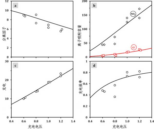 圖3a顯示了這一點分離因子隨充電電壓降低,但親和效應(yīng)不會減少很多,并且在高電壓下也繼續(xù)發(fā)揮重要作用。充電和離子吸附容量隨充電電壓的增加而增加。圖3d顯示充電效率遠低于單位,這可以通過在充電步驟開始時從活性炭表面解吸共離子來解釋。