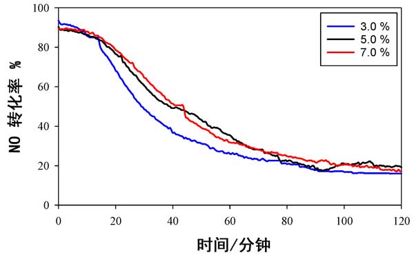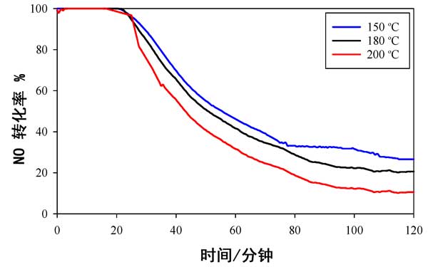 使用活性炭載錳氧化物催化劑時,不同溫度下NO轉化率數據與時間的關系如圖2所示。它用于提供可以與以前發(fā)布的數據進行比較的基線數據。在所有溫度(150°C,180°C和200°C)的前20分鐘內,幾乎有100%的NO轉化發(fā)生,但在此初始階段后NO轉化迅速下降,并且在2小時的測試后,轉化率不足20%。活性的溫度依從性依次為150°C>180°C>200°C。