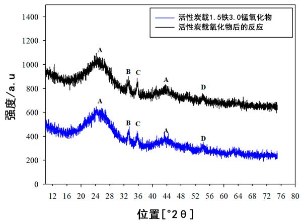 來自活性炭載鐵錳氧化物的XRD數據顯示在圖5中,其中已鑒定出主要峰。在2θ=24°和2θ=43°處的寬峰(標記為A)與無定形碳的峰一致。它們的位置和寬度在新鮮和經過測試的催化劑中都相同,這表明活性炭無定形結構的穩(wěn)定性。在新鮮催化劑和測試催化劑中,在2θ=33.5°,2θ=35.1°和2θ=54.3°處分別出現了另外三個峰(分別標記為B,C和D),并且位置或峰強度沒有明顯變化作為反應測試的結果。2θ=33.5°(峰標記為B)處的峰歸因于Fe 2 O 3 和在2θ=35.1°和54.3°的峰歸因于Fe 3 Mn 3 O 8,盡管在新鮮和測試的催化劑中這些與鐵有關的峰的強度和寬度相同,但是由于XRD峰較弱,因此很難確定在測試過程中鐵和錳的結晶度是否發(fā)生了變化。然而,結合的鐵氧化物與錳氧化物確實原因形成Fe 3的Mn 3 ö 8固體溶液,其可在的活性炭載鐵錳氧化物催化劑的NO轉化。