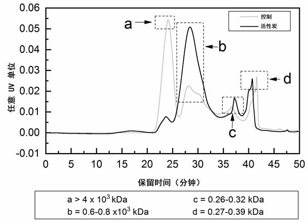 為了檢驗(yàn)活性炭改變可溶性微生物組成,使其對(duì)膜具有更高的親和力這一假設(shè),通過(guò)GPC分析了構(gòu)成可溶性微生物的有機(jī)分子的大小分布(圖1)。在第二次可溶性微生物運(yùn)行結(jié)束時(shí)收集了可溶性微生物樣品(圖1b),有趣的是,GPC色譜圖顯示了對(duì)照反應(yīng)堆和活性炭加入反應(yīng)堆之間的明顯差異。在活性炭反應(yīng)器的可溶性微生物中,保留時(shí)間為24分鐘時(shí),來(lái)自對(duì)照反應(yīng)器的可溶性微生物的第一個(gè)峰顯著降低,而在活性炭反應(yīng)器的可溶性微生物中,在28分鐘時(shí)觀(guān)察到峰的上升(圖1,分別是峰值a和b);钚蕴糠磻(yīng)器的可溶性微生物中的37分鐘處的峰也升高(峰c)?扇苄晕⑸镏心承┯袡C(jī)化合物含量的變化(升高或降低)可能歸因于,由于微生物群落組成的變化或某些活性炭所觀(guān)察到的代謝活性增強(qiáng),導(dǎo)致某些微生物產(chǎn)品的產(chǎn)生和分泌增加另外,或抑制進(jìn)水橄欖油廢水中物質(zhì)的降解。有機(jī)化合物對(duì)活性炭顆粒的吸附只會(huì)降低其在可溶性微生物中的外觀(guān)。由于吸附到活性炭上,可溶性微生物中某些成分的減少(如峰a所示)也有可能優(yōu)先吸附其他成分,這些成分對(duì)通量的減少更不利,或者起膜調(diào)節(jié)前體的作用,這可能會(huì)增強(qiáng)生物膜的生長(zhǎng)(例如峰b–d)。顯然,確定膜上有機(jī)污染物的身份是一項(xiàng)必不可少的任務(wù),目前,尚不清楚不同可溶性微生物組分對(duì)膜污染的詳細(xì)影響以及它們被活性炭的吸附。