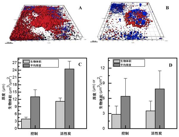 為了分析由于在膜生物反應(yīng)器中添加活性炭而導(dǎo)致生物膜形成增加的可能性,并進(jìn)一步闡明活性炭反應(yīng)器中膜性能下降幅度更大的原因,在第一個(gè)處理結(jié)束時(shí)進(jìn)行了檢測(cè)(圖2A,B)。在比較兩個(gè)反應(yīng)器之間生物膜結(jié)構(gòu)的性質(zhì)時(shí),可以觀(guān)察到活性炭反應(yīng)器通量下降的增加顯然與生物膜生長(zhǎng)的幅度有關(guān)。在第一次膜生物反應(yīng)器運(yùn)行結(jié)束時(shí)從模塊上獲取的兩塊膜上生物膜的CLSM分析顯示,活性炭和對(duì)照反應(yīng)器之間細(xì)胞的生物體積及其自相關(guān)EPS的差異很大(圖2)。當(dāng)補(bǔ)充活性炭時(shí),生物膜生長(zhǎng)的升高支持了膜滲透性的更高降低,這是由可溶性微生物組分吸附的升高引起的,這可能會(huì)更好地調(diào)節(jié)膜表面,從而增強(qiáng)生物膜的形成。