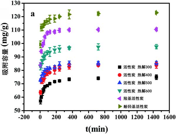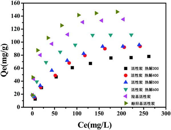 大量研究表明,有機(jī)污染物在水介質(zhì)上的吸附包括分配和吸附作用。為了評估在活性炭上吸附化合物時在碳化相中的吸附和在非碳化相中的分配的貢獻(xiàn),雙模式模型在該研究領(lǐng)域中被成功引用。通過雙模式模型計算了多菌靈在不同濃度的活性炭上的分配和吸附。在該實驗中,雙模型為所有樣品的等溫線提供了良好的擬合(圖3)。在本研究中,所有活性炭上多菌靈的吸附均大于分配所有多菌靈濃度的吸附。但是,隨著多菌靈濃度的增加,分配(Q p)和吸附(Q ad)對總吸附的貢獻(xiàn)也不同。在低濃度范圍內(nèi),吸附大于在活性炭上的分配,并且Q ad值貢獻(xiàn)超過總吸附的97%。但是,在高濃度范圍內(nèi),多菌靈對不同樣品在整體吸附中的分配和吸附的貢獻(xiàn)不同。當(dāng)多菌靈的濃度達(dá)到300 mg L-1時在熱解300、400、500攝氏度的活性炭上,吸附對總吸附的貢獻(xiàn)仍然遠(yuǎn)遠(yuǎn)大于分配作用。盡管活性炭中含O官能團(tuán)的含量逐漸減少,但分配對總吸附的貢獻(xiàn)率卻逐漸增加,特別是對于羧基活性炭和酚羥基活性炭,它們的Q p值分別達(dá)到39.4%和44.13%。主要原因可能是樣品表面上含O官能團(tuán)的減少導(dǎo)致更好地暴露于樣品表面和多菌靈濃度增加,從而導(dǎo)致吸附過程飽和。因此,多菌靈可以分配給非碳化相。