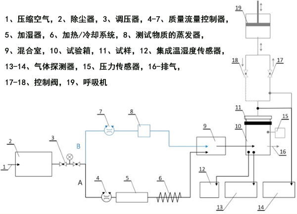 在測(cè)試過(guò)程中,干燥的壓縮空氣通過(guò)裝有減壓器的顆粒過(guò)濾器輸送到系統(tǒng)中,該壓力過(guò)濾器的調(diào)節(jié)范圍為0-8 bar。然后將其分為兩條線(圖2):用于溫度和相對(duì)濕度調(diào)節(jié)的線A和用于調(diào)節(jié)測(cè)試室內(nèi)測(cè)試物質(zhì)濃度的線B。將來(lái)自管線A的給定溫度和相對(duì)濕度的空氣與來(lái)自管線B的激發(fā)蒸汽在混合室中混合,然后將活性炭鎖定在直徑為11.3的氣動(dòng)樣品架中,并將其引入測(cè)試室。另外,在脈動(dòng)流測(cè)試期間使用了連接到測(cè)試室出口的呼吸機(jī)。呼吸機(jī)設(shè)定為25個(gè)循環(huán)/分鐘和2 L/沖程,這對(duì)應(yīng)于每分鐘25吸氣和25呼氣,呼吸量為2L。呼吸機(jī)的氣流模式為正弦曲線。脈動(dòng)流量測(cè)試期間的挑戰(zhàn)濃度得到補(bǔ)償,以確保將總負(fù)載標(biāo)準(zhǔn)化為穩(wěn)態(tài)流量條件。實(shí)驗(yàn)以四個(gè)變體進(jìn)行,每個(gè)變體評(píng)估不同因素(即挑戰(zhàn)濃度,相對(duì)濕度,挑戰(zhàn)流速,挑戰(zhàn)流型)對(duì)活性炭復(fù)合材料吸附特性的影響。
