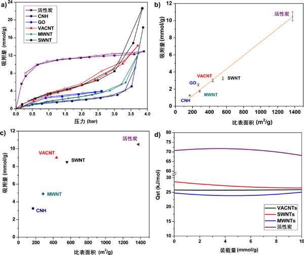 兩種吸附劑在25°C下的二氧化硫吸附等溫線如圖3a所示;钚蕴康奈饺萘靠蓺w因于微孔的存在。如圖分析所示,微孔占活性炭的總可用表面積的幾乎89.5%。在1bar時,碳納米角的二氧化硫攝入量最低,其次是碳納米管和氧化石墨烯。在圖3b中,繪制了在1bar下SO 2的吸附量與吸附劑的BET比表面積的函數(shù)關(guān)系。在1 bar時,BET比表面積和SO 2吸附之間幾乎存在線性關(guān)系。在相對壓力P/P 0小于0.3的近環(huán)境條件下,發(fā)現(xiàn)氧官能團的影響更為明顯。在我們對單壁碳納米管的TEM測量中,我們看到了少量的多壁碳納米管和其他催化劑雜質(zhì)的存在。這些異物的存在可能是SWNT中觀察到的SO 2吸收率低的原因之一。