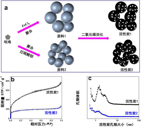 圖1和一個示出了活性炭材料的制備方法。首先,使用不同的氧化劑(FeCl 3和過硫酸銨)通過吡咯單體的氧化聚合反應合成了兩種樣品。其次,對原材料進行二氧化碳活化處理,以制備具有高孔隙率的活性炭。進行氮吸附測量以獲取關(guān)于他們的比表面積的數(shù)據(jù)。