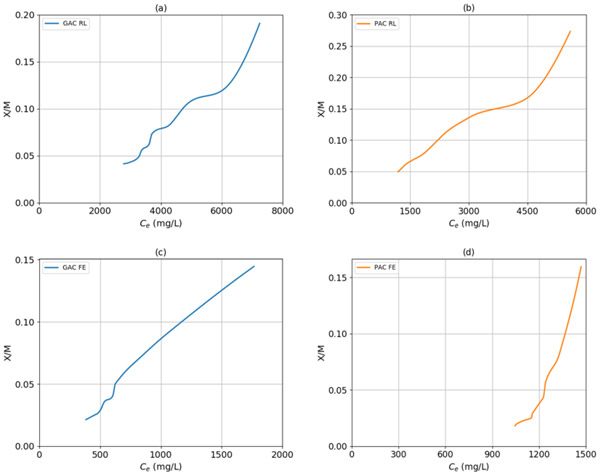 圖1顯示了顆;钚蕴颗c原浸出液,粉狀活性炭與原浸出液,粉狀活性炭與廢液以及粉狀活性炭與廢液的實驗等溫線。兩個樣品的曲線和兩個活性炭對應于S形的等溫線(II型)的行為,因為曲線是凹向上,所以多層吸附進行活性炭的表面上。利用該信息,就滲濾液而言,不管活性炭顆粒的性質(zhì)和大小如何,都可以假定吸附劑中殘留的化學需氧量是通過物理吸附發(fā)生的。