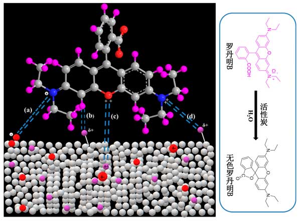 羅丹明B降解機理示意圖。活性炭的表面上存在幾個官能團,它們可以與羅丹明B染料分子相互作用?赡艿南嗷プ饔煤喪鋈缦拢(a)活性炭的–COOH基團與羅丹明B的負(fù)電性基團之間的相互作用,(b)活性炭的–OH基團與羅丹明B的芳環(huán)之間的氫鍵,(c)氫鍵活性炭的–OH基團與羅丹明B的x噸基團之間存在(d)活性炭和羅丹明B染料分子的表面官能團之間的靜電相互作用。