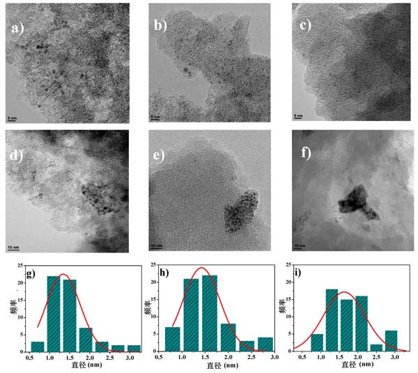 活性炭載釕催化劑獲得的TEM圖像如下。必須提到的是,盡管通常觀察到分散良好的釕納米顆粒(圖1 a–c),但也發(fā)現(xiàn)了一些顆粒團(tuán)聚(圖1d–f),特別是在使用最氧化的活性炭載體。顆粒大小分布已在圖1g–i中以條形圖繪制,分別為幾種不同活化后的活性炭載體制成的催化劑平均顆粒大小分別為1.3、1.4和1.6 nm。一般而言,TEM數(shù)據(jù)表明,所用的浸漬方法成功地在活性炭材料上形成了小的釕納米顆粒(平均尺寸小于2 nm),并且似乎隨著載體的氧化,其粒徑略有增加。這可以涉及到的釕前體的氧官能團(tuán)的錨固,和它們的部分分解的還原熱處理期間的效果,這可能導(dǎo)致一些金屬燒結(jié)。