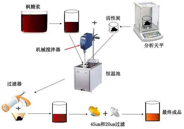 根據(jù)實驗測試活性炭使黑楓糖漿變色的機制,使用食品級活性炭作為吸附材料,以改善深色楓糖漿的顏色和氣味/味道,從而生產與淡糖漿或琥珀色糖漿。圖1說明了該測試中使用的變色過程。為了進行實驗,我們使用了不同量的活性炭(0.01、0.03和0.05 g),并引入10 mL楓糖漿樣品中,以得到0.1、0.3和0.5g/100 mL的最終濃度。然后,將混合物放入恒溫池中,以便通過使用電動攪拌裝置來調節(jié)工作溫度和攪拌速度。攪拌(混合)時間設置為20、40和60分鐘。在混合時間結束時,首先通過使用簡單的紙過濾器過濾混合物,以去除使用過的活性炭的大顆粒。通過使用兩個分別具有45和20μm的篩孔尺寸的注射器過濾器進行第二次過濾。