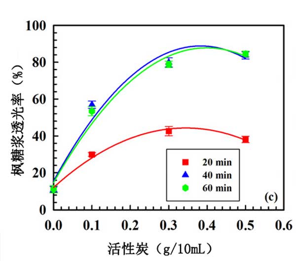 楓糖漿透光率隨混合時間和添加的活性炭濃度的變化。楓糖漿的透光率隨活性炭混合時間(20、40和60分鐘)的變化(活性炭類型不同)而變化如圖3所示。獲得的結果表明,活性炭通過使用40分鐘的處理時間,吸附動力學達到了最大值。在這種情況下,獲得的最大透光率為83.70±0.21%。此后,吸附達到飽和。但是,在固定使用濃度的活性炭下,混合時間的影響在20分鐘的處理中最低;旌40至60分鐘之間未觀察到明顯差異。