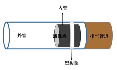 模擬的測(cè)試環(huán)境包含內(nèi)部和外部?jī)刹糠值脑嚬苓M(jìn)行吸附。外管的長(zhǎng)度為50cm,直徑為3.8cm。該管的功能是將排氣消聲器連接至氣體分析儀,而內(nèi)管則用作活性炭的儲(chǔ)存器。改變內(nèi)管的長(zhǎng)度,以確定活性炭負(fù)載百分比對(duì)降低廢氣濃度的影響。直徑分別為3cm,4cm和5cm。管子之間有一個(gè)密封,以防止廢氣泄漏。管的結(jié)構(gòu)在圖1中進(jìn)行了描述。
