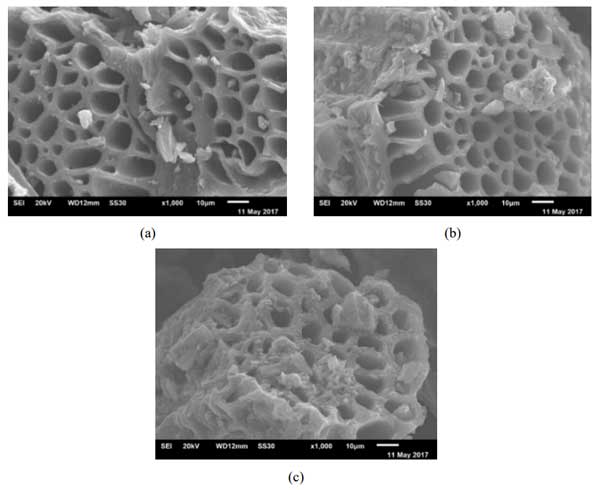圖2:活性炭載氧化鎂的SEM表征,(a)70:30的比例,(b)80:20的比例,(c)90:10的比例。