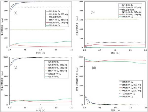 在大氣或高壓下沒有氧氣的情況下進(jìn)行的基線活性炭測試中吸附的NO,NO 2,氮氧化物和氮氧化物的濃度曲線證實(shí),即使在200 psig的高壓下也不會(huì)發(fā)生NO 2的形成或大量NO的吸附。在沒有氧氣的情況下,活性炭催化劑上沒有NO吸附。即使在200 psig下,NO也無法物理吸附在活性炭表面上,而且氧氣的存在也是必不可少的以促進(jìn)NO在化學(xué)吸附的氧位點(diǎn)上的化學(xué)吸附。
