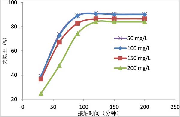 圖2展示了在30°C下各種接觸時間和初始苯酚濃度(50–200mg/L)下苯酚去除率的特征。由于在活性炭上存在空位,所以吸附劑對苯酚的吸收隨時間的推移而改善。開發(fā)了超過水相和固相之間傳質(zhì)阻力的強大驅(qū)動力。這是導(dǎo)致苯酚分子從一開始就迅速吸收的原因,后來在達到平衡之前下降。在平衡狀態(tài)下,由于苯酚分子與吸附劑表面之間的排斥力無法吸附苯酚分子,因此吸附劑的空位無法達到最大苯酚吸收量。苯酚的初始濃度影響除去的苯酚和平衡時間。初始濃度為100mg/L時,最大吸附量為90.06%,而200mg/L時為83.95%。在較低的苯酚初始濃度下(苯酚分子與空位的比率較小),由于活性炭載納米銀材料上存在更多的空位,所以在平衡狀態(tài)下吸附的苯酚量較高。隨著比率隨著初始苯酚濃度的增加而增加,空位容易變得飽和,苯酚分子趨于競爭擴散到內(nèi)部孔中,導(dǎo)致吸附劑表面的吸收百分比降低。從該實驗中,所有濃度的2小時后去除率均無顯著增加。因此,接觸時間(60–120分鐘)和濃度(100–200mg/L)是個好選擇。