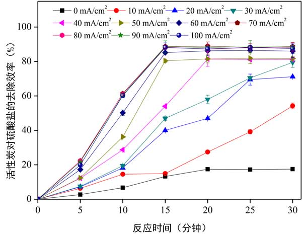 電流密度是一個關(guān)鍵參數(shù),它不僅影響凝結(jié)劑的用量,還影響氣泡的形成速率,氣泡的大小和絮凝物的生長。各種選定的電流密度:0、10、20、30、40、50、60、70、80、90和100mA/cm2在批量實(shí)驗(yàn)中應(yīng)用了,以建立電凝與活性炭耦合過程的有利電流密度范圍。在30分鐘的反應(yīng)時間下使用鋁不銹鋼陽極/陰極電極對進(jìn)行連續(xù)電凝工藝,并使用反應(yīng)器中的活性炭濃度為0.2g/L來研究電流密度對硫酸鹽的影響去除效率。與活性炭吸附工藝相比,電凝加活性炭即使在低電流密度(10mA/cm2)時也可以顯著提高去除效率。如圖2所示,活性炭吸附過程和電凝活性炭吸附偶聯(lián)過程的去除效率在5分鐘時分別為2.7%和6.3%,在30分鐘時分別為17.5和54.2%。由于偶合體系中的反應(yīng)比簡單的活性炭吸附過程更復(fù)雜,因此去除效率有所提高。電凝結(jié)合活性炭吸附對硫酸鹽去除效率有重要影響。結(jié)果表明,去除效率隨著電流密度的增加而顯著提高。電流密度為70mA/cm2時,去除效率最高(88.9%)。這種現(xiàn)象可以歸因于這樣的事實(shí),即在高電流密度下,氧化金屬的數(shù)量增加,從而導(dǎo)致大量的Al(OH)3(s)顆粒有利于去除污染物。