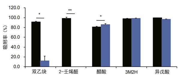 圖2: 活性炭和氧化鋅對異味揮發(fā)性有機(jī)化合物的吸附能力。黑色和藍(lán)色條分別表示活性炭和氧化鋅。