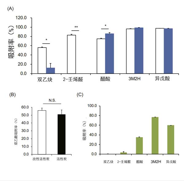 圖3:活性炭對產(chǎn)生異味的揮發(fā)性有機(jī)化合物的吸附能力。(A)改性活性炭和氧化鋅的吸附水平。(B)使用相同含量的活性炭和改性活性炭,比較改性活性炭和活性炭的二乙酰基吸附水平。(C)二氧化鈦對各種VOC的吸附水平。